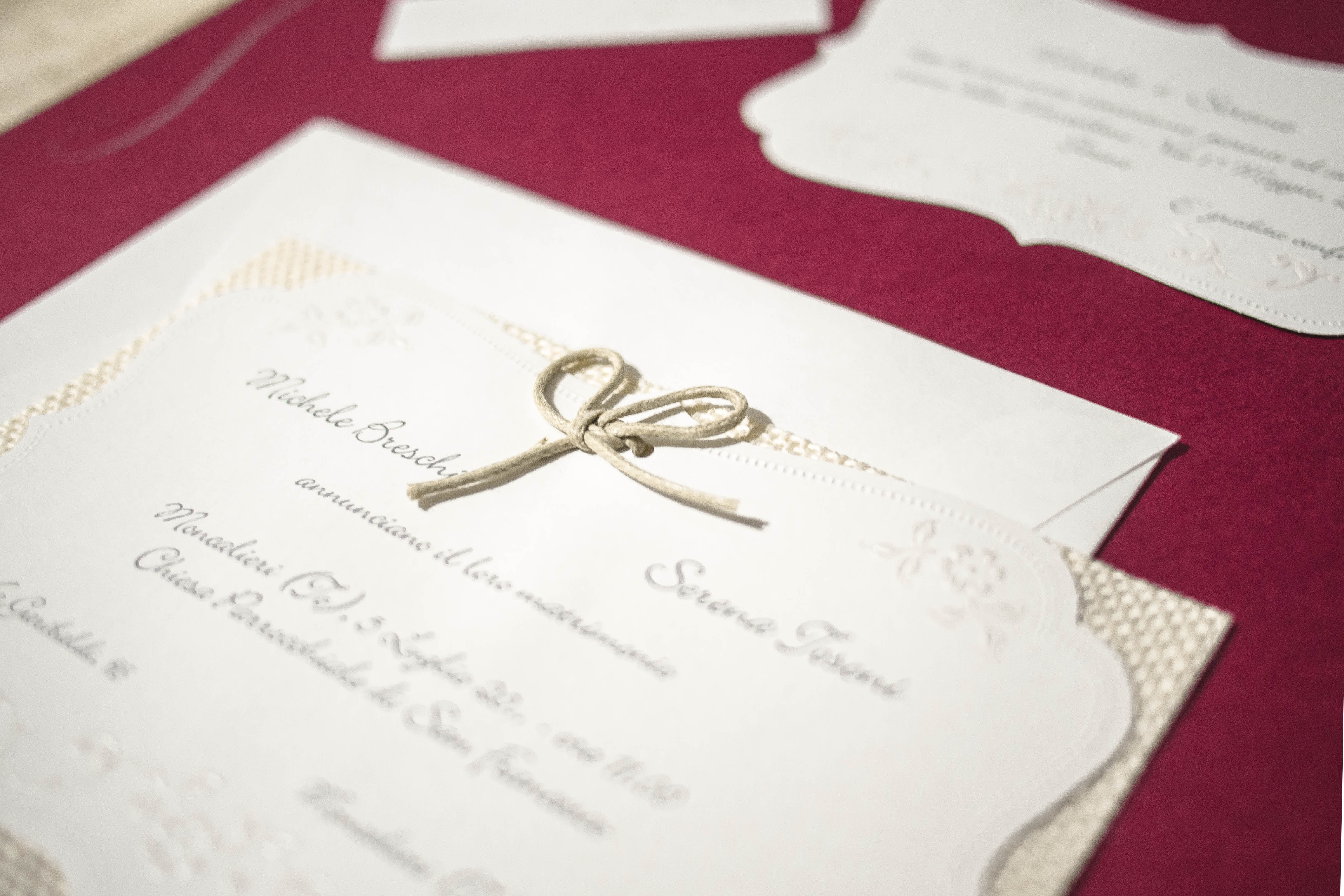 Un cartoncino bianco con dettagli in termorilievo perlato poggiato su un rettangolo di juta beige chiaro. Il tutto viene tenuto insieme da un fiocco in spago chiaro.