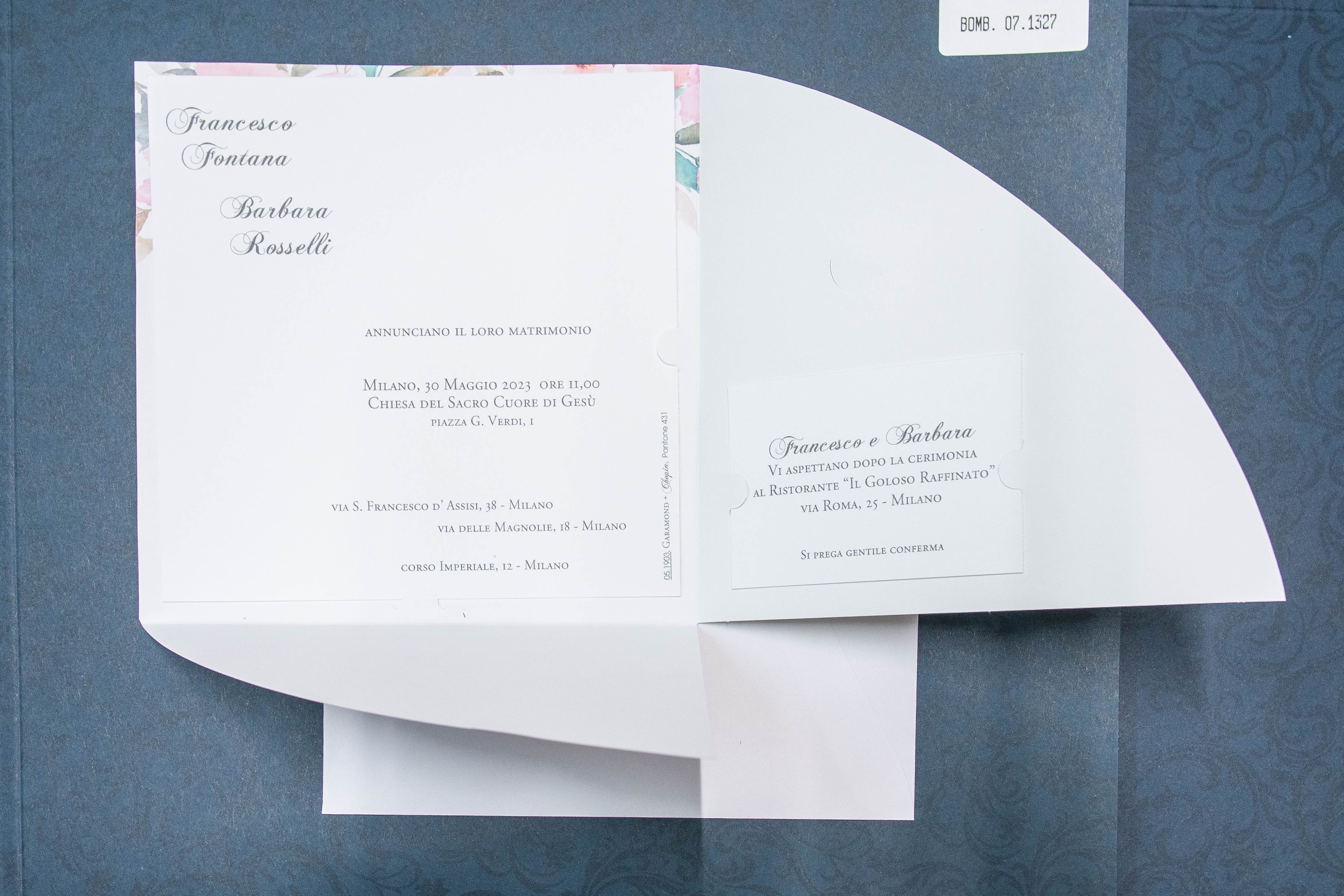 Partecipazione di matrimonio elegante con dettagli floreali stampati.