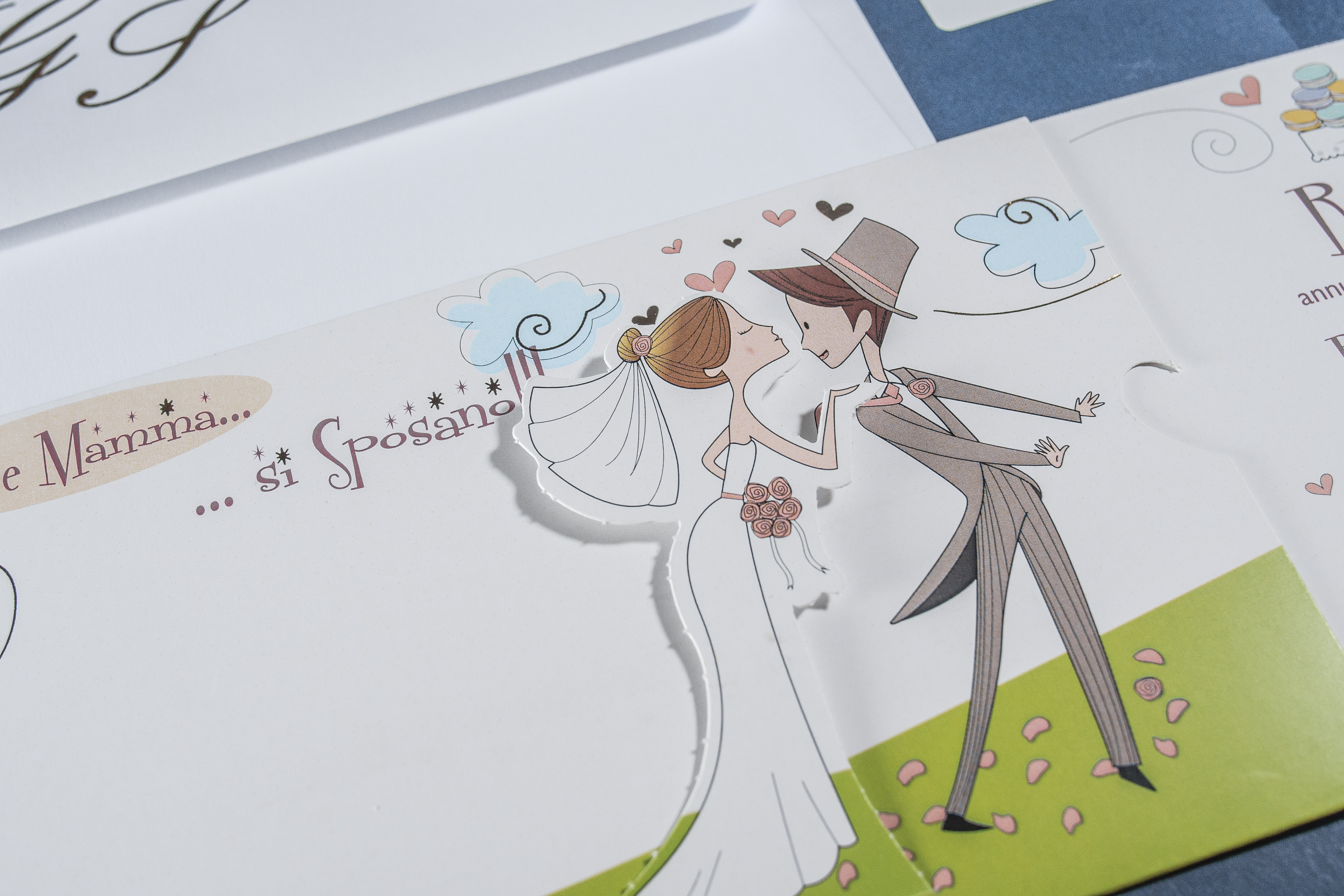 La partecipazione che raffigura una sposa che bacia da lontano il suo sposo, il tutto corredato da incisioni in oro a caldo.