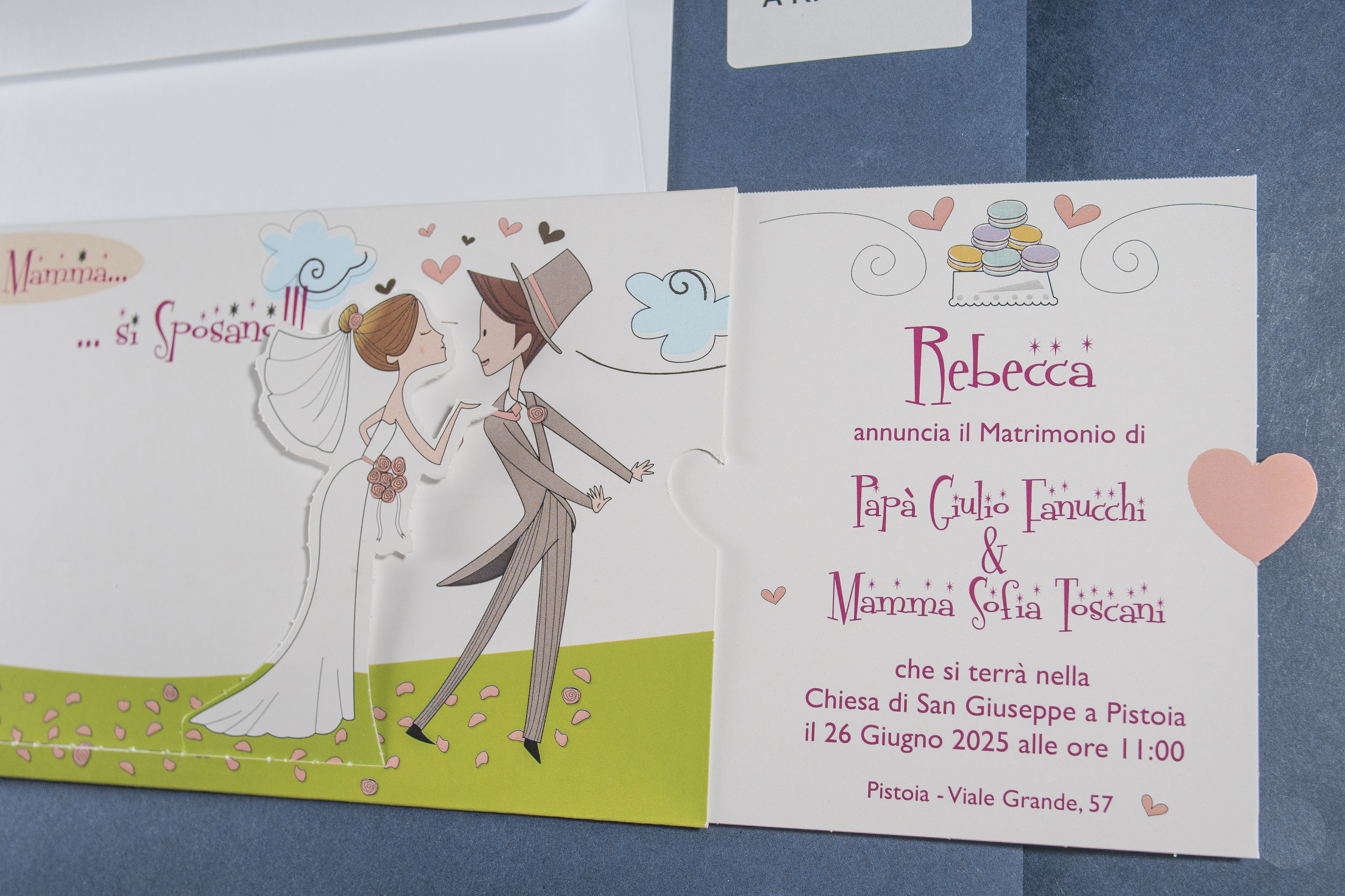 Caratteristica importante è che si tratta di una partecipazione 'mobile': infatti tirando il cuore sulla destra verrà mostrato l'invito stampato al suo interno.
