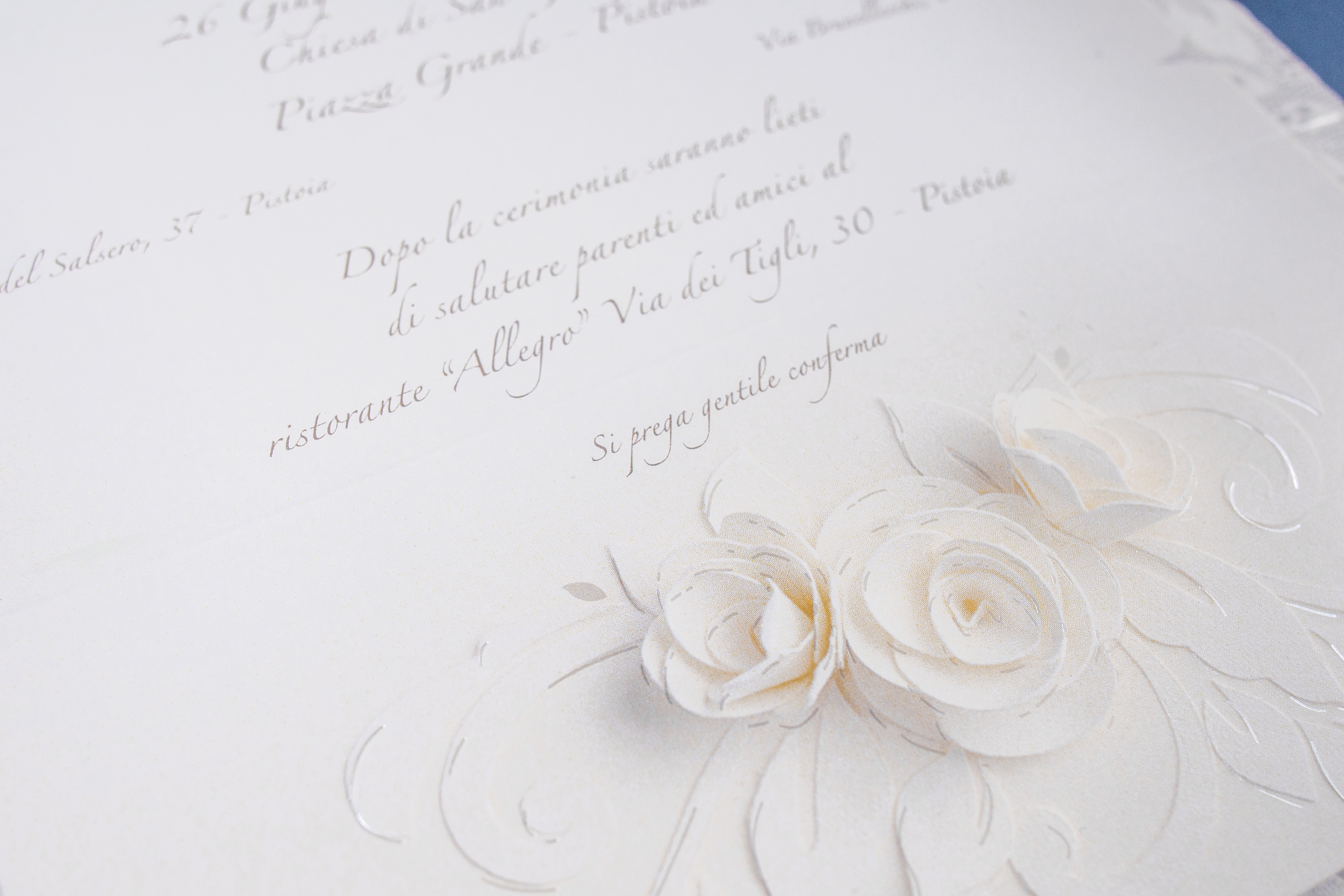 Partecipazione di matrimonio formato posterino, con immagini floreali sullo sfondo prestampate, con dettagli incisi in oro a caldo.