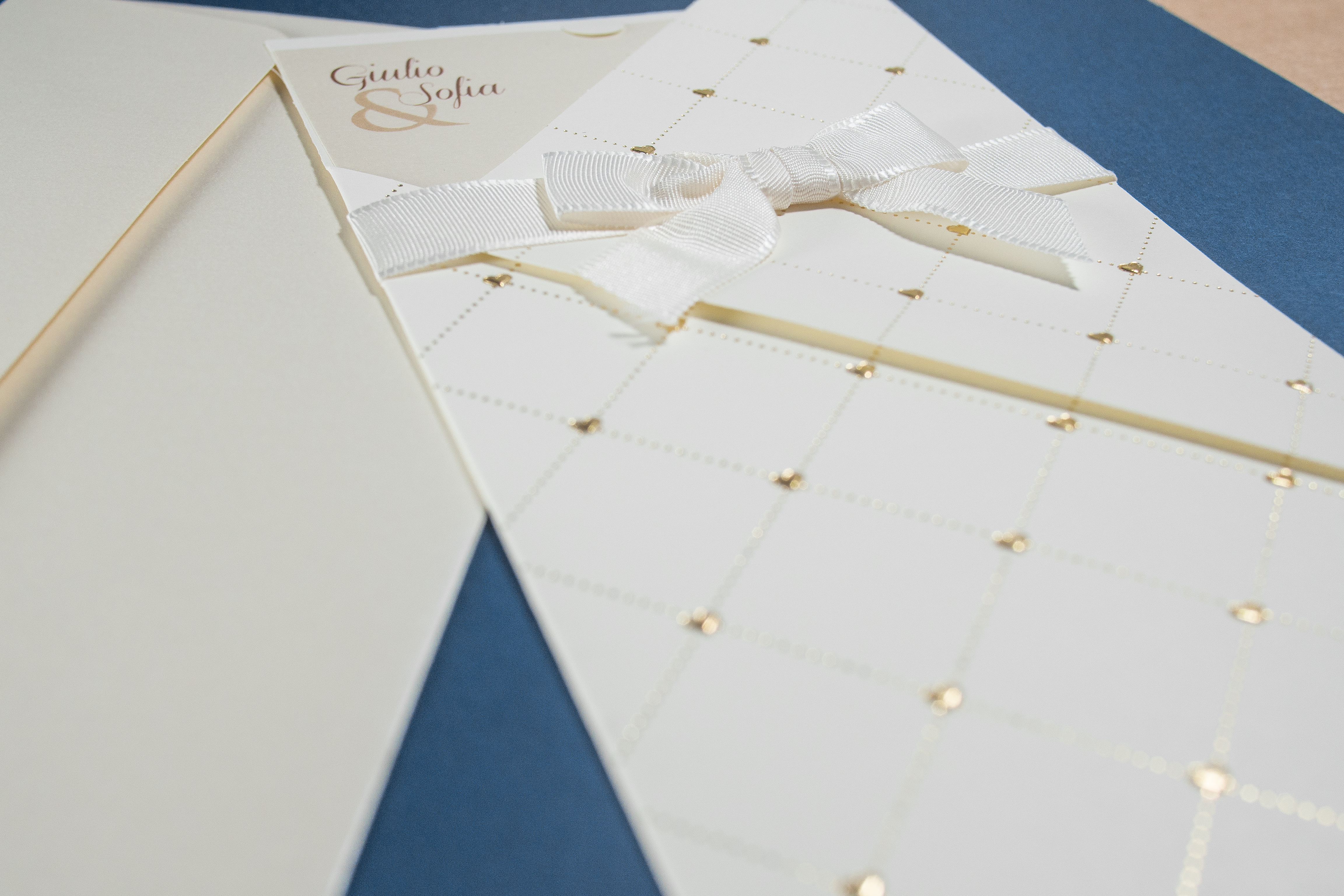 Partecipazione di matrimonio elegante dal taglio rettangolare in cartoncino avorio con un motivo romboidale tracciato da micro incisioni in oro a caldo e con l'aggiunta di un fiocco satinato a chiudere la partecipazione.