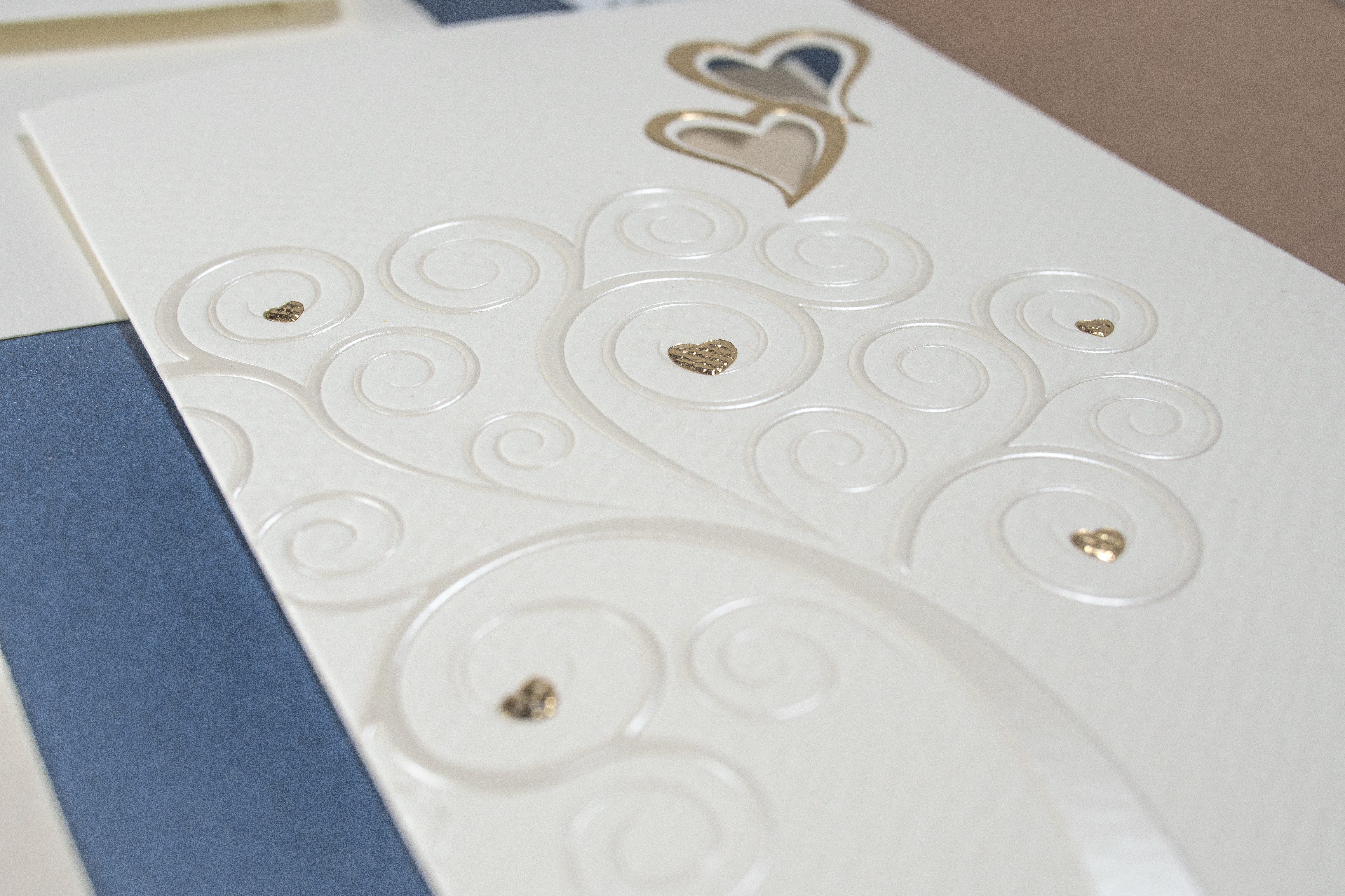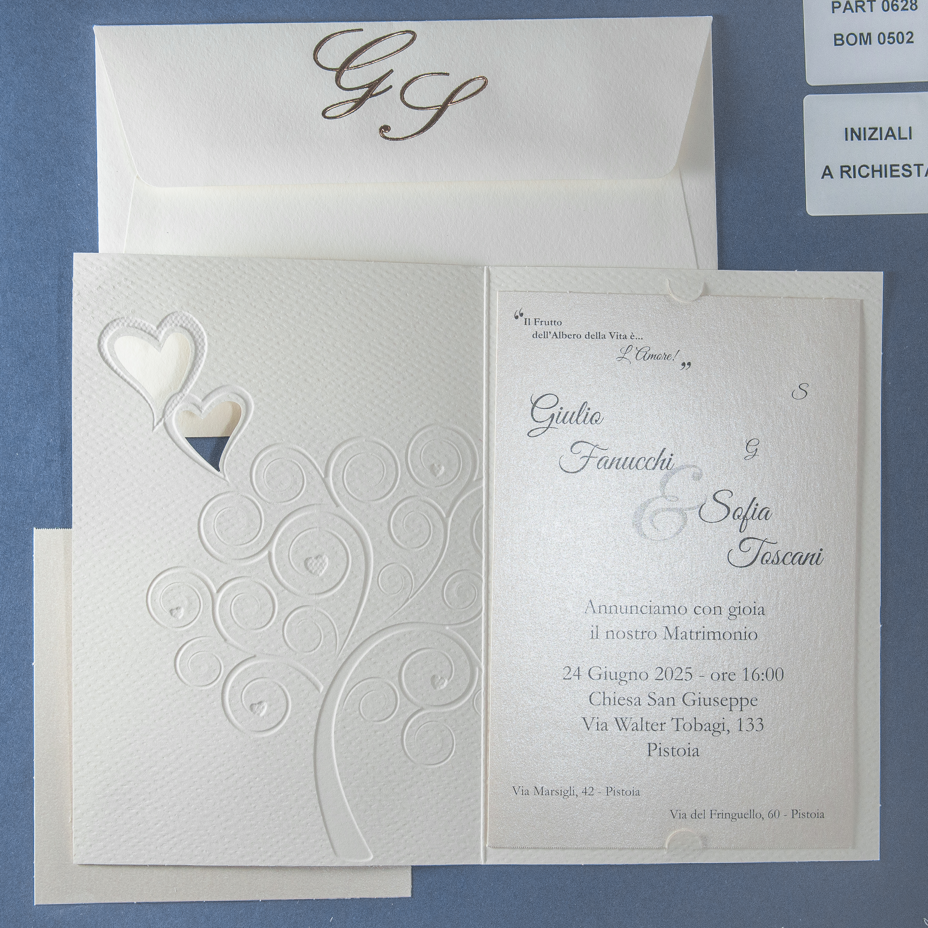 Il cartoncino della partecipazione è bianco tendente all'avorio, leggermente martellato. La carta all'interno è satinata.