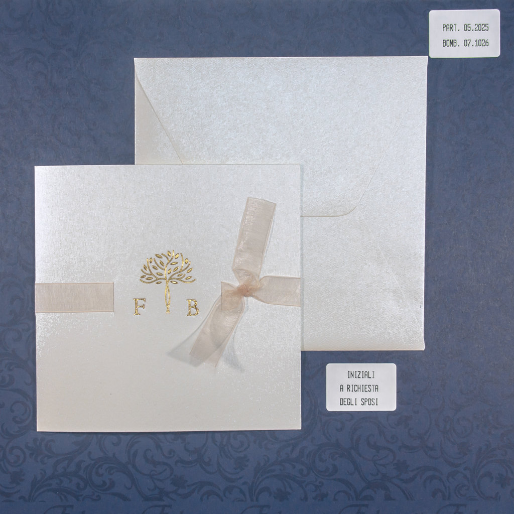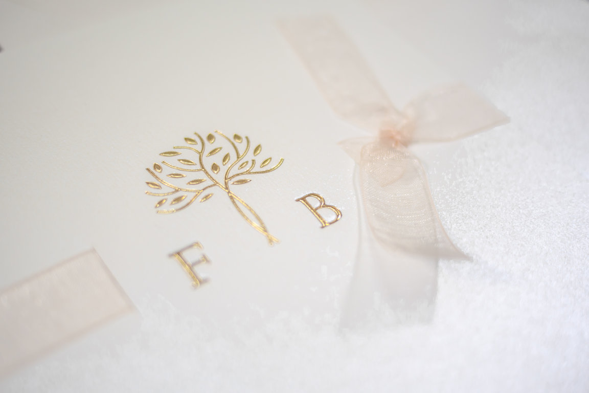 Il cartoncino interno è bianco martellato, quello esterno è satinato impreziosito da un nastrino rosato e dall'incisione di un albero della vita in oro a caldo.