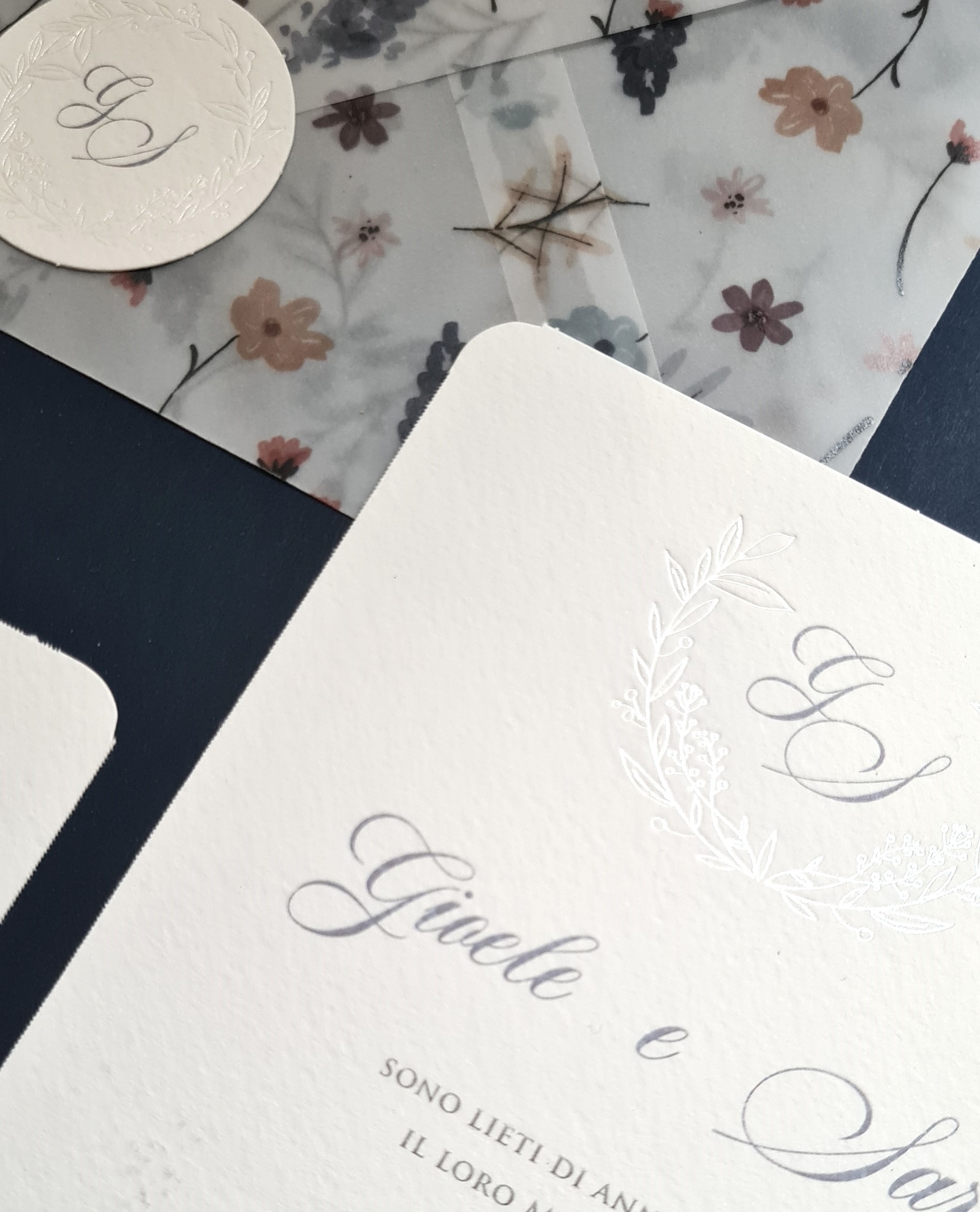 Partecipazione di matrimonio shabby in cartoncino bianco martellato, con motivo floreale in perlato a caldo.